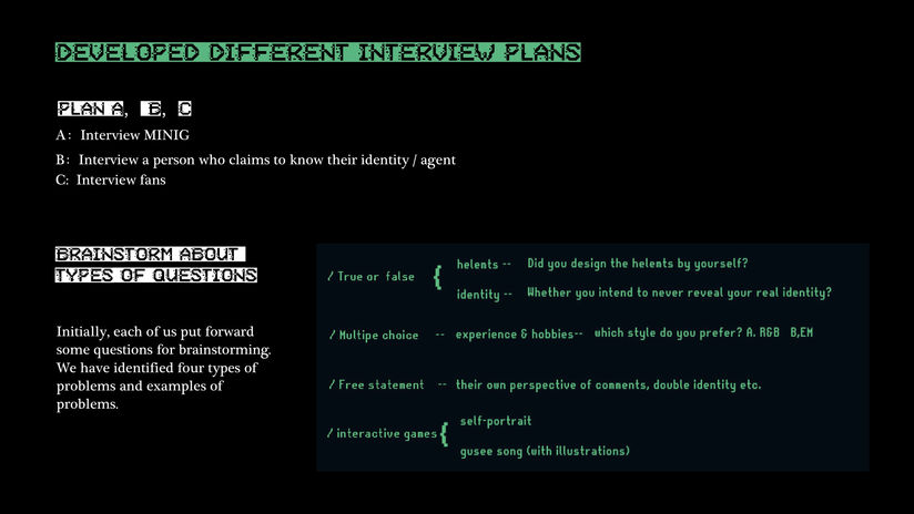 PlanB is We found a self-proclaimed insider on the Internet who knows the true identity of the Minig members. But we still had some doubts when writing the interview questions: We found a man who claimed to know the real identity of MINIG, but when We think about questions that We can ask, we feel that these questions seem to be verifying the authenticity of the secret of MINIG's identity. In other words, the interview is like a process of verifying whether the evidence of their double identity is true. This makes us confused; we don't know if this is feasible.